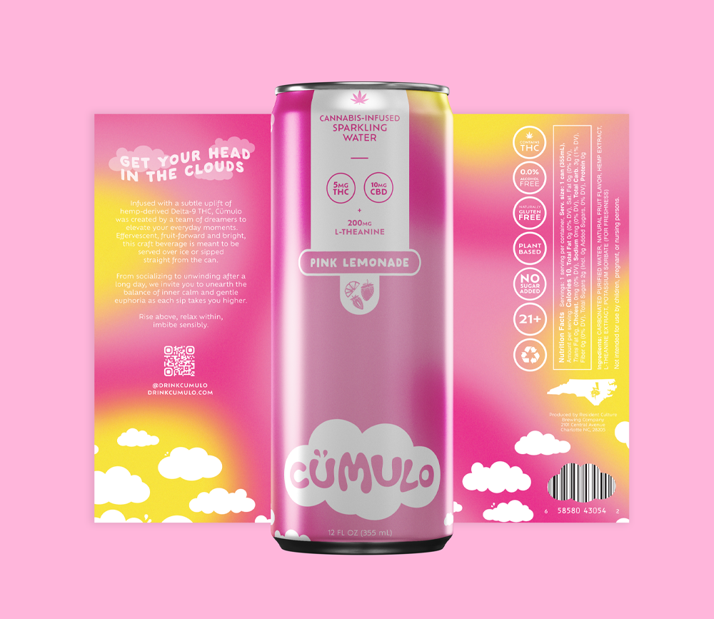 Colorful mesh gradients, a 5-swatch neon color palette, and noise texture overlay were selected as key label design elements to align with 2025 cannabis beverage trends. These elements ensured shelf standout with modern energy while appealing to wellness-focused younger consumers seeking calm excitement over gimmicks. The noise texture added craft depth, balancing boldness with approachability for target audience resonance.