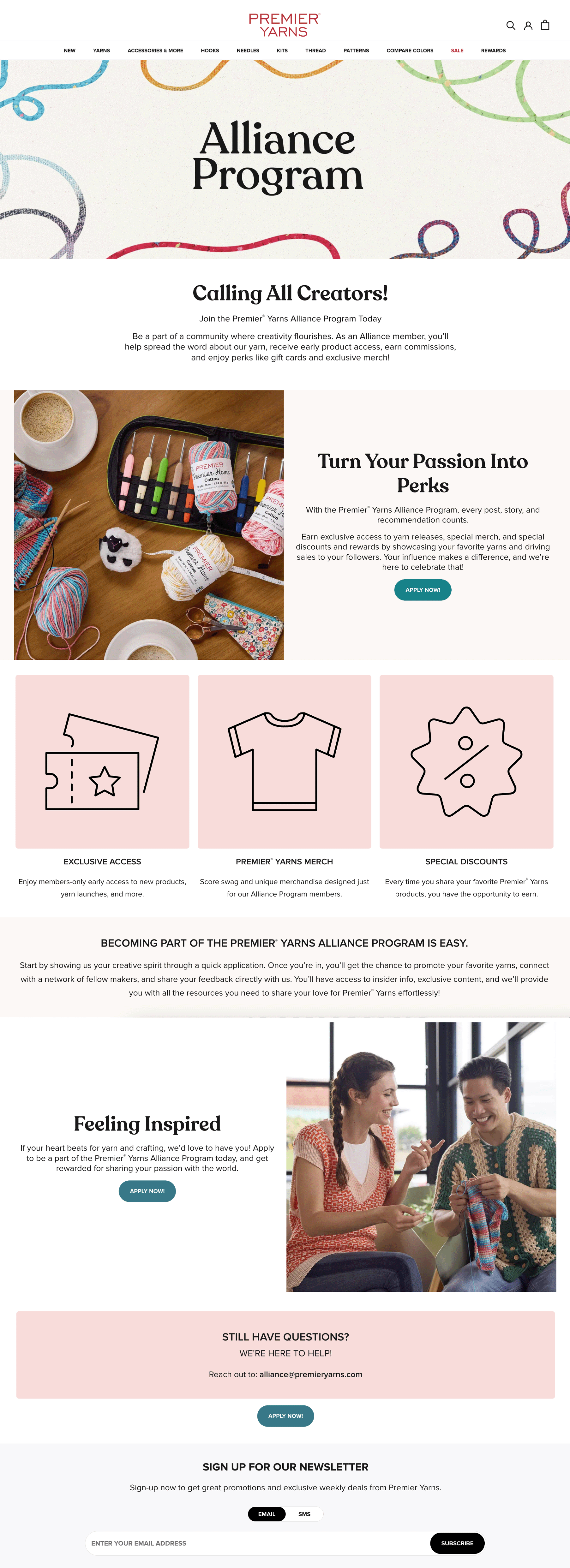 When the sign-up page for the Premier Yarns Alliance Program needed a facelift, I worked with software and development teams to redesign in a way that better suited the challenges presented. I designed an intuitive and easy to navigate landing page for the program, with CTA buttons leading straight to Premier's partner integrations. This allowed interested customers to learn about the program, check out the benefits offered to members, and easily stay in touch along the way.